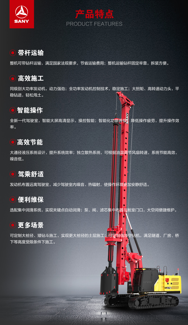 SR175-S适用(yong)于(yu)工(gong)民(mín)建(jian)、市(shi)政、電(dian)网電(dian)力(li)桩等(deng)領(ling)域(yu),可(kě)实現(xian)浅孔大(da)桩、低矮钻進(jin)等(deng)特殊工(gong)况,在(zai)土层、砂(sha)层等(deng)地質(zhi) 施工(gong)高(gao)效,运转靈(ling)活。