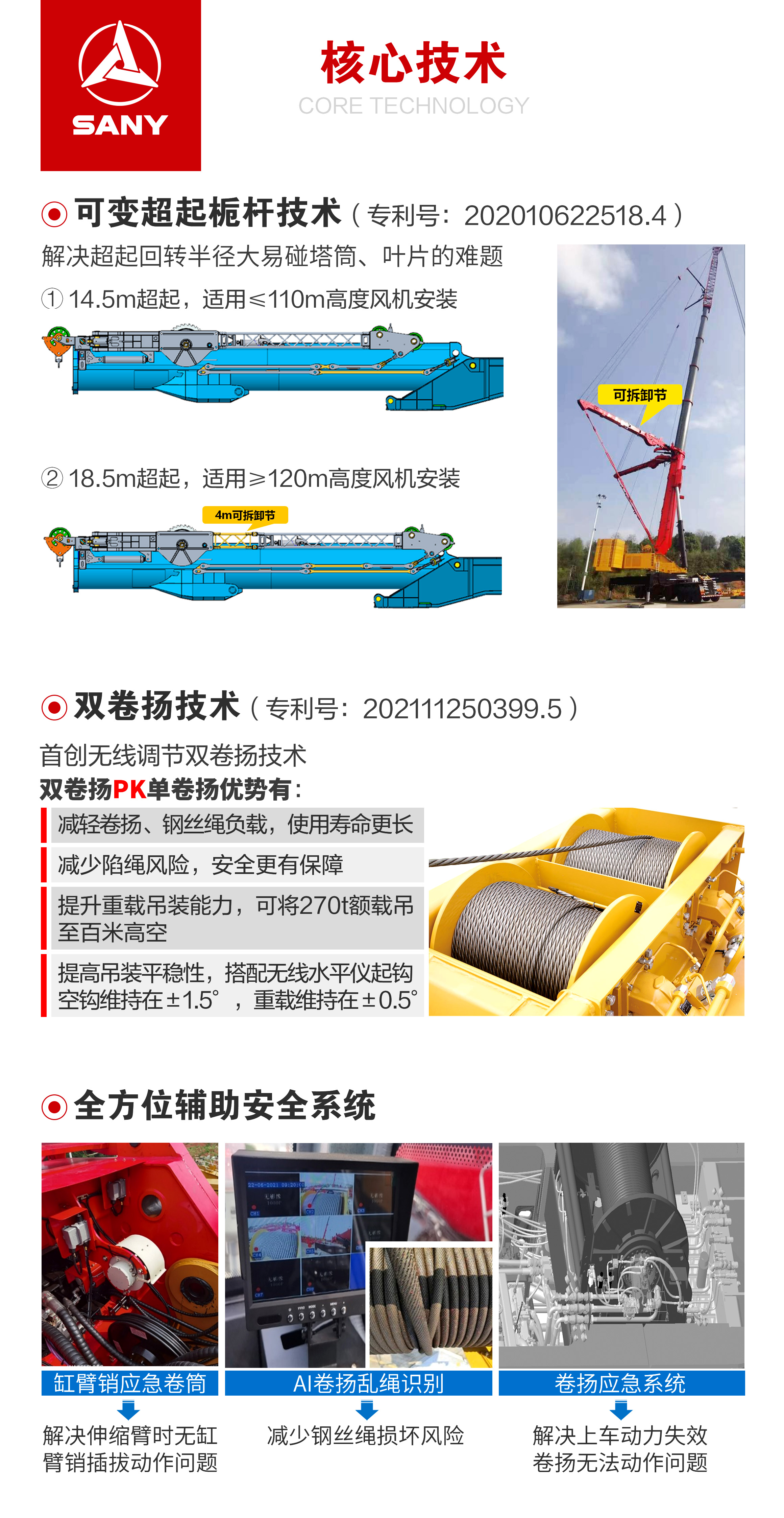 可(kě)将270载吊至百(bai)米高(gao)空;无線(xiàn)调節(jie)双卷扬技(ji)術(shù),风機(jī)檢(jian)修不限(xian)绳;无線(xiàn)水平仪重(zhong)载起钩±0.5°,吊裝(zhuang)更精(jīng)准。