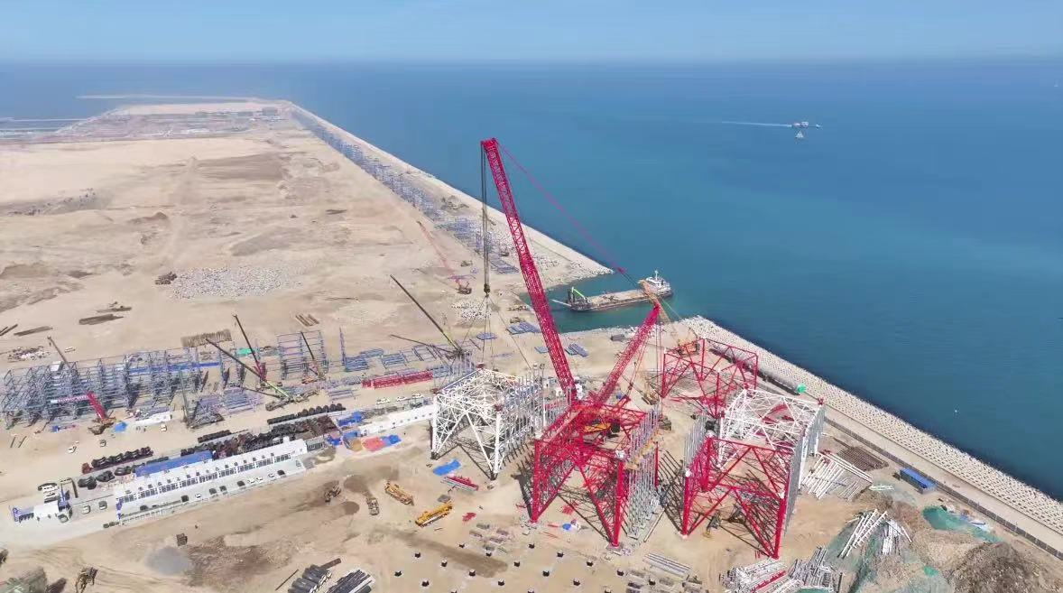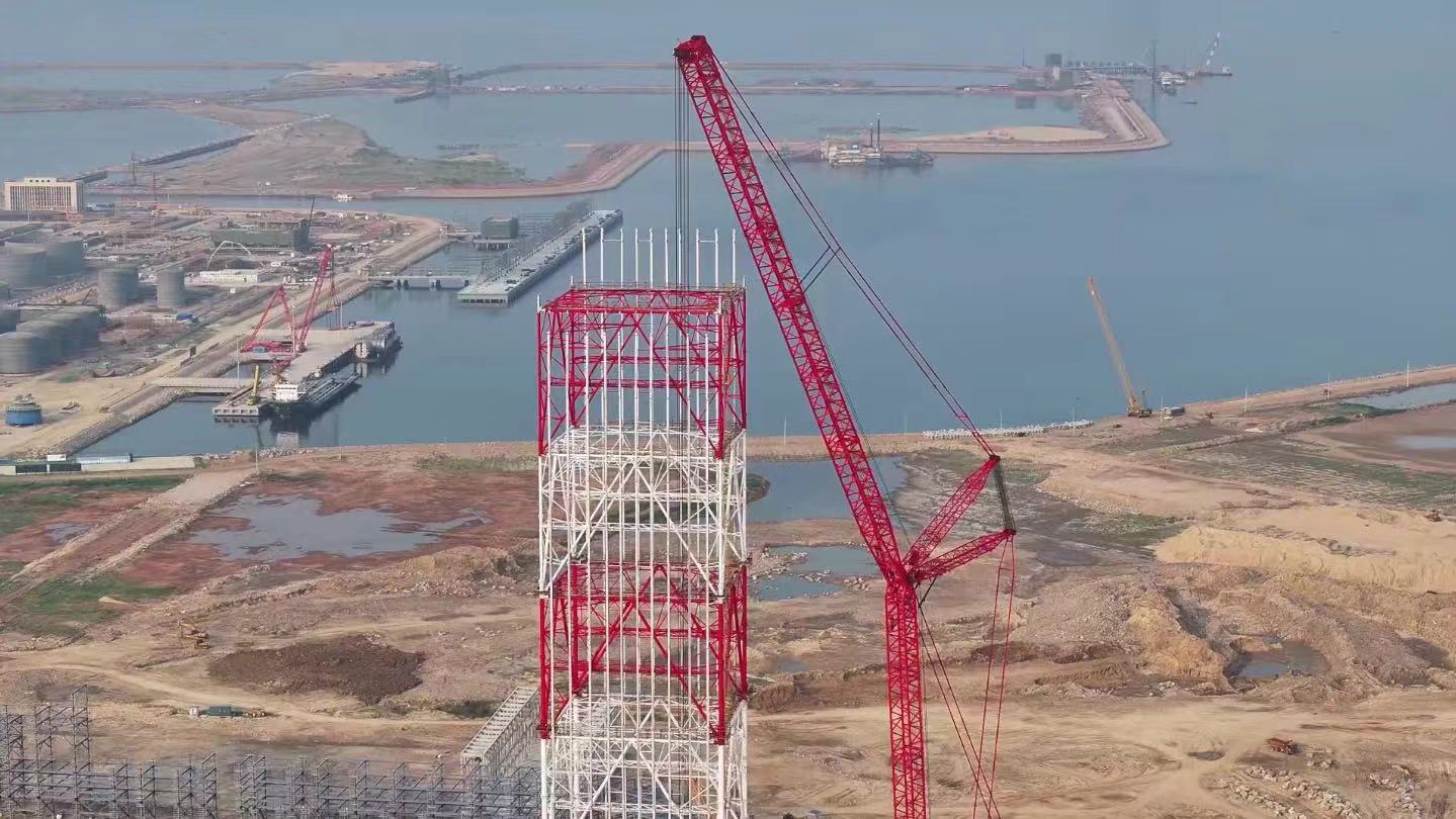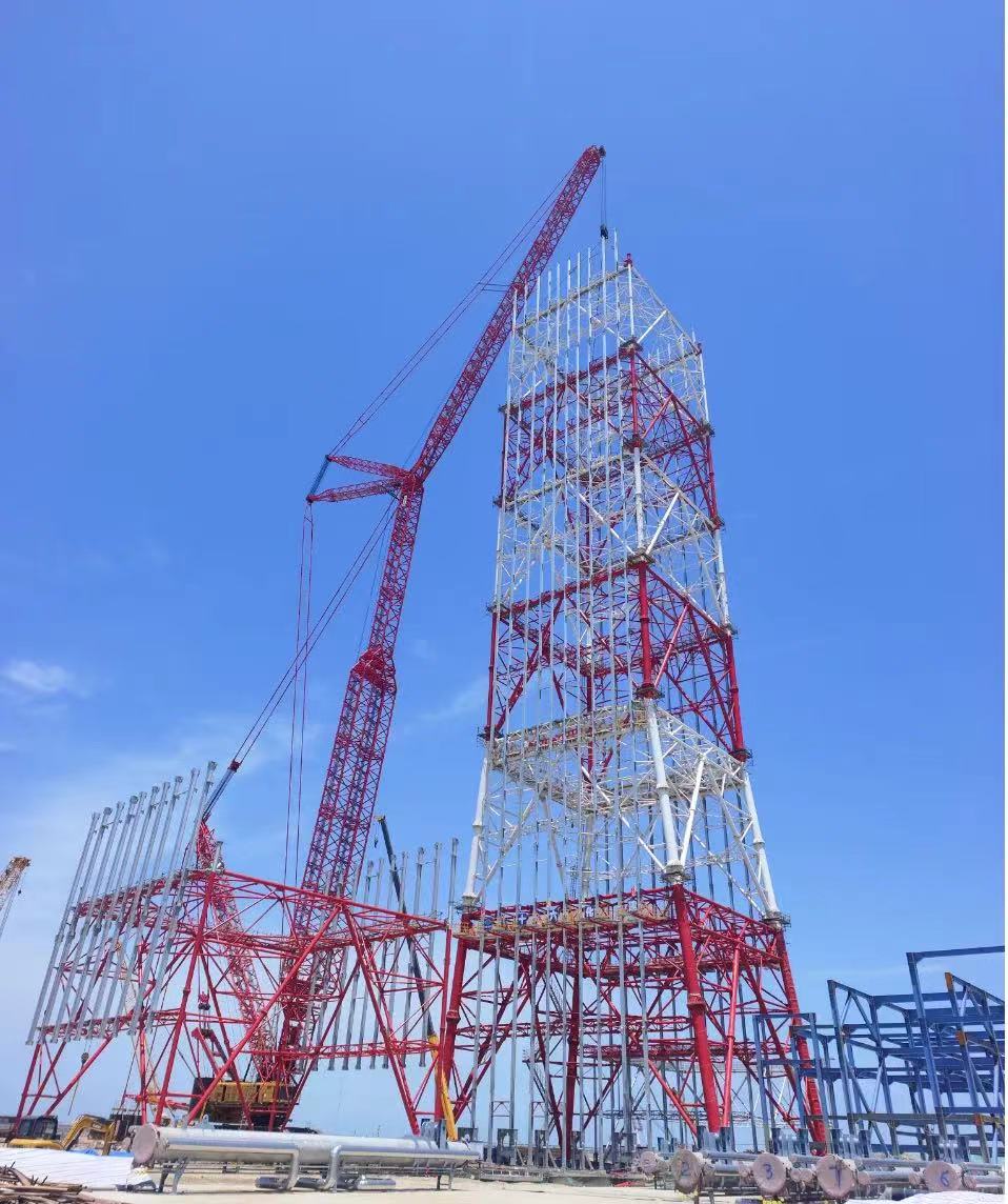 山(shān)东海湾吊裝(zhuang)工(gong)程(cheng)股份有(yǒu)限(xian)公(gōng)司2000吨级履带起重(zhong)機(jī)SCC20000A,在(zai)裕龙石化炼化一(yi)體(ti)化項(xiang)目(mu)(一(yi)期)成(cheng)功完成(cheng)火炬塔架封顶。