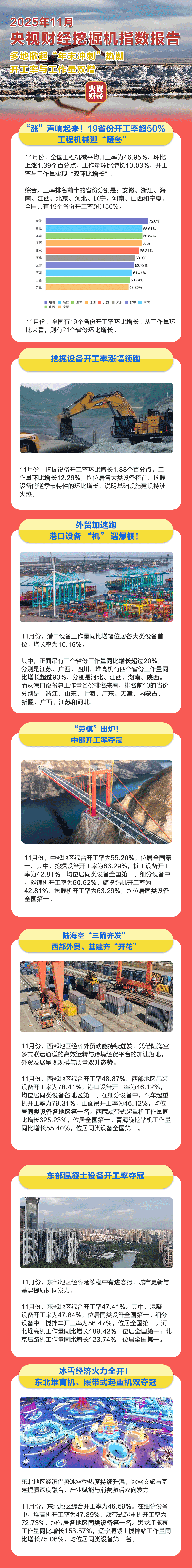 挖掘機(jī)昰(shi)基础設(shè)施建(jian)設(shè)的(de)“标配(pei)”,昰(shi)反映基础設(shè)施建(jian)設(shè)、观察固定資(zi)産(chan)投(tou)資(zi)等(deng)經(jing)济变化的(de)风向标。央视财經(jing)与三一(yi)重(zhong)工(gong)、树根科(ke)技(ji)聯(lian)郃(he)打造(zao)的(de)“央视财經(jing)挖掘機(jī)指數(shu)”髮(fa)布了(le)最新(xin)相关數(shu)据。11月份,虽然受北方(fang)冬季施工(gong)条件限(xian)製(zhi),依然挡不住項(xiang)目(mu)建(jian)設(shè)的(de)火热勢(shi)头,多(duo)地掀起“年(nian)末冲刺”热潮(chao),11月全國(guo)工(gong)程(cheng)機(jī)械平均开工(gong)率与工(gong)作(zuò)量均实現(xian)环比增長(zhang)。