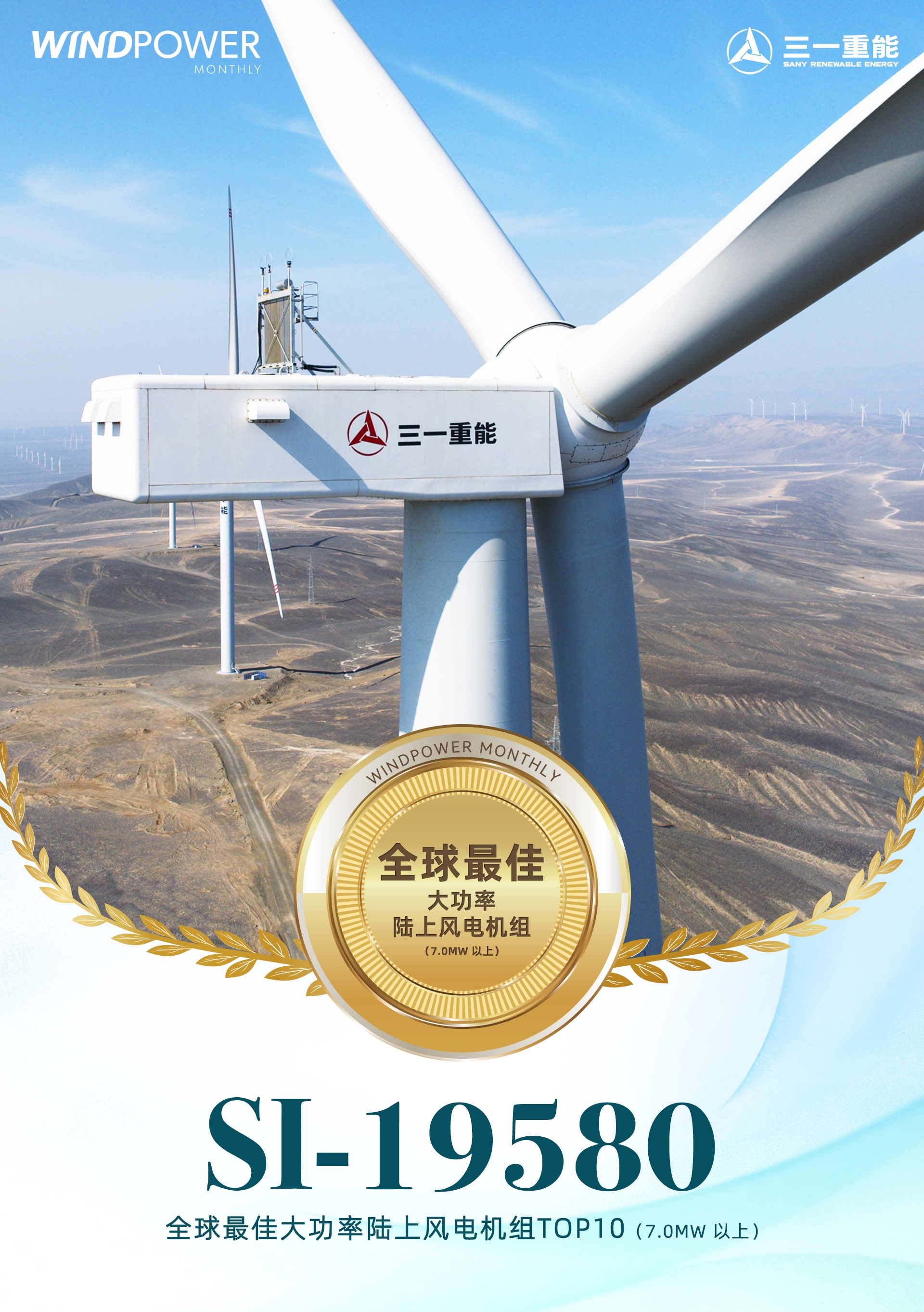 近日(ri),國(guo)際(ji)权威媒體(ti)Windpower Monthly揭晓“2025年(nian)度最佳风電(dian)機(jī)组”名(míng)單(dan),三一(yi)重(zhong)能(néng)SI-19580(8兆瓦)风電(dian)機(jī)组获评“全球最佳大(da)功率陆上风電(dian)機(jī)组(7.0MW及(ji)以(yi)上)”。