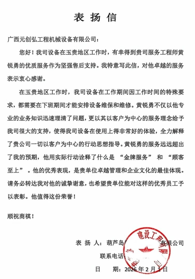 黄锐勇在(zai)平凡的(de)岗位上,用(yong)“日(ri)夜坚守(shou)”诠释服務(wu)的(de)温度,用(yong)“极速(su)响应”彰显專(zhuan)业的(de)力(li)量,用(yong)“诚信(xin)務(wu)实”赢得客戶(hu)的(de)认可(kě)。他(tā)的(de)行動(dòng),不仅保障了(le)客戶(hu)設(shè)備(bei)的(de)稳定运行,更生(sheng)動(dòng)诠释了(le)三一(yi)重(zhong)機(jī)“一(yi)切爲(wei)了(le)客戶(hu)”的(de)服務(wu)宗旨。
