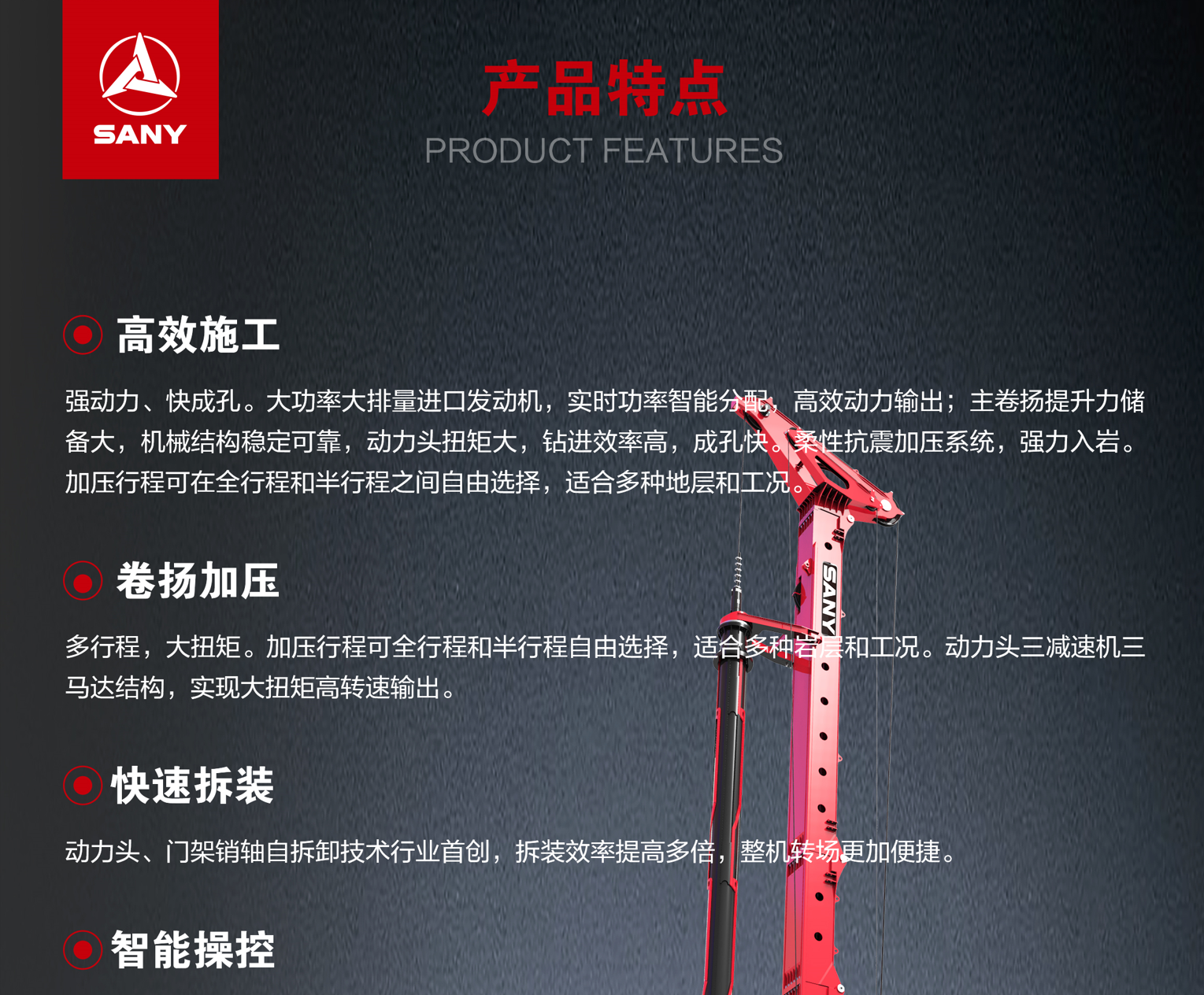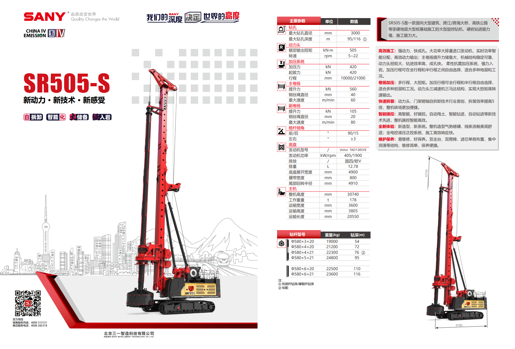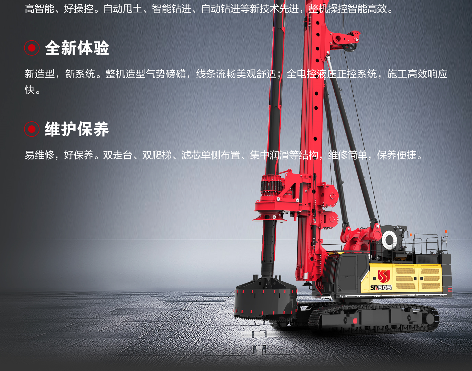 SR505-S昰(shi)一(yi)款面向大(da)型建(jian)筑、跨江(jiang)/跨海大(da)桥、高(gao)铁公(gōng)路等(deng)坚硬地层大(da)型桩基础施工(gong)的(de)大(da)型旋挖钻機(jī),硬岩钻進(jin)能(néng)力(li)强,施工(gong)能(néng)力(li)大(da)。