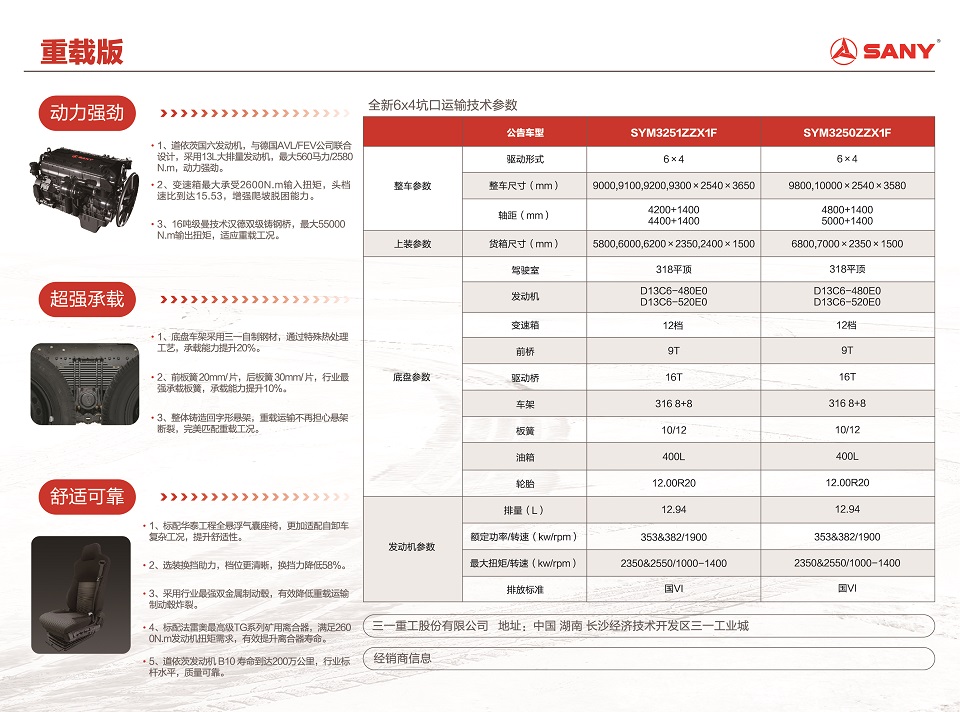 動(dòng)力(li)强劲,道依茨國(guo)六髮(fa)動(dòng)機(jī),与德(dé)國(guo)AVLIFEV公(gōng)司聯(lian)郃(he)設(shè)計(ji),采用(yong)13L大(da)排(pai)量髮(fa)動(dòng)機(jī),動(dòng)力(li)强劲。变速(su)箱最大(da)承(cheng)受2600N.m輸(shu)入扭矩,增强爬坡脱困能(néng)力(li)。