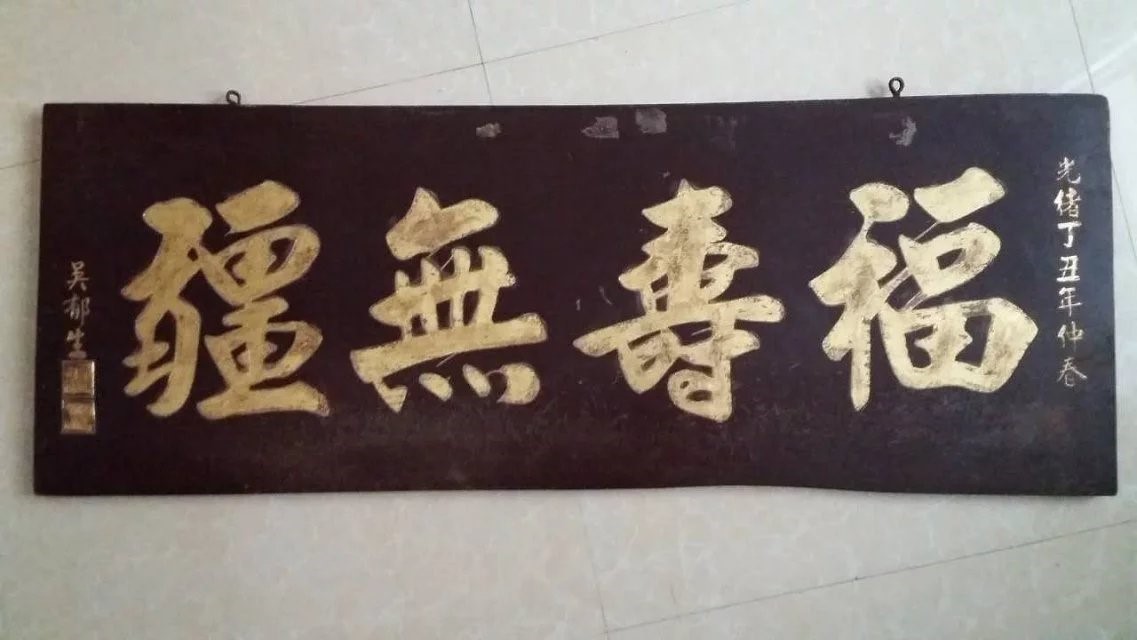 吴郁生,字蔚若,江苏省吴县人,是嘉庆戊辰科状元吴延琛的孙子,16岁应考县试,名列前茅。光绪三年他正好24岁,在京都会试,与曾霖光的长孙曾庆选同科春考,他们俩一个是官宦之后,一个是富商之子,同是公子哥们,志同道合,期间吴郁生曾患感冒,曾庆选悉心照料,两人很快结为挚友。考试结束后,曾庆选邀请吴郁生南下穗城游玩,吴郁生很喜欢这位书弟,于是两人携手来到广州十三行“万成”商号。在穗城短短数天,他看到曾庆选家族恪守父辈商道,且常往迹于省府要员左右,在穗城商海名气颇高,听闻曾氏家族乐意兴学,倾情慈善事业,感动过三朝阁老阮元为曾庆选的祖父题匾《有福人家》,让他曾氏家人对肃然起敬。在与闲聊中,得知曾霖光公元配邹太夫人精勤慎敏、教子相夫,子孝孙贤,和邻睦族,在乡间尽享尊荣,还听说大夫人九五高寿仍步稳体健,依能掌控家业发展鸿图,家中正准备为大夫人筹备寿宴,吴郁生显得十分敬仰,在曾庆选家人央求下,想请这名门之后为邹老夫人题匾,经不断怂恿,吴郁生为邹老夫人题匾《福寿无疆》以示崇敬,这是吴郁生出道前难见的手笔,实为珍贵。