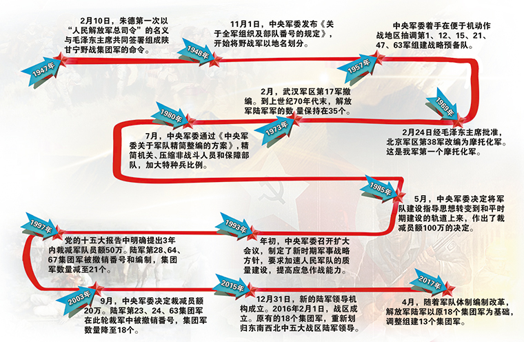 在解放军的发展历程中,陆军最初用的是“军”或“纵队”的番号;1948年,野战部队实行正规编制,“纵队”改为“军”;1985年,“百万大裁军”时又将“军”升级为“集团军”。