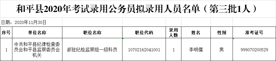 附件:和平县2020年考试录用公务员拟录用人员名单(第三批1人)