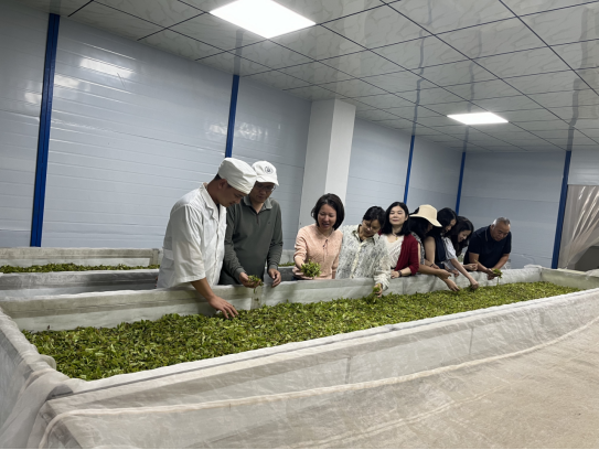 为深入了解茶叶加工的核心技术环节,茶场制茶师带领考察团全程参观了制茶车间,详细展示了从鲜叶到成品的全流程关键工序。制茶师着重讲解了萎凋与杀青阶段的温湿度精准控制要求、时间把握以及操作中的核心注意事项,并介绍了发酵条件的控制要点、干燥设备的使用技巧等直接影响茶叶风味形成和保质期的核心技术环节。专家团队在观摩过程中,就制茶设备升级、工艺参数优化等方面提供了专业的技术建议。